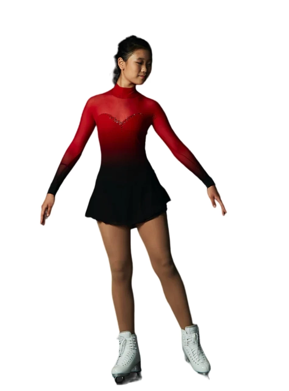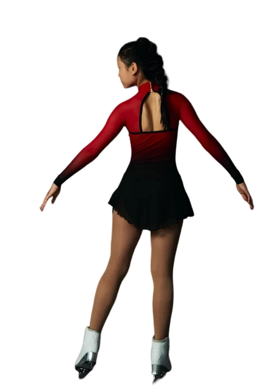 Classical faded red and black dress with crystals and mesh long sleeves with a chiffon skirt for figure skating by Elite Xpression.