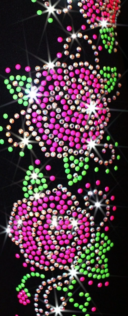 Polartec power stretch ice skating pants featuring neon pink and green rhinestuds and sparkly rhinestones roses. This design swirls around the right leg and shines with over 1000 stones. Available in Polartec fleece and Supplex Microfiber (non fleece)fabric. Polartec fleece is best for winter times and kids beginning to skate, non fleece options is great for summer time, advanced level adult skaters. Matching ice skating jacket will complete the look of this clean and sophisticated design set. Practice your favorite figure skating elements and learn new ones in fun, vibrant and sophisticated clothes form figureskatingstore.com