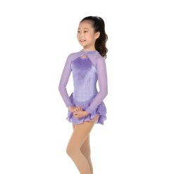 Soft shimmer velvet dresses with long mesh sleeves, double layer georgette skirts edged in silver, and tiny front keyholes with a ring of accent crystals for a necklace style look. Traditional style back keyhole.