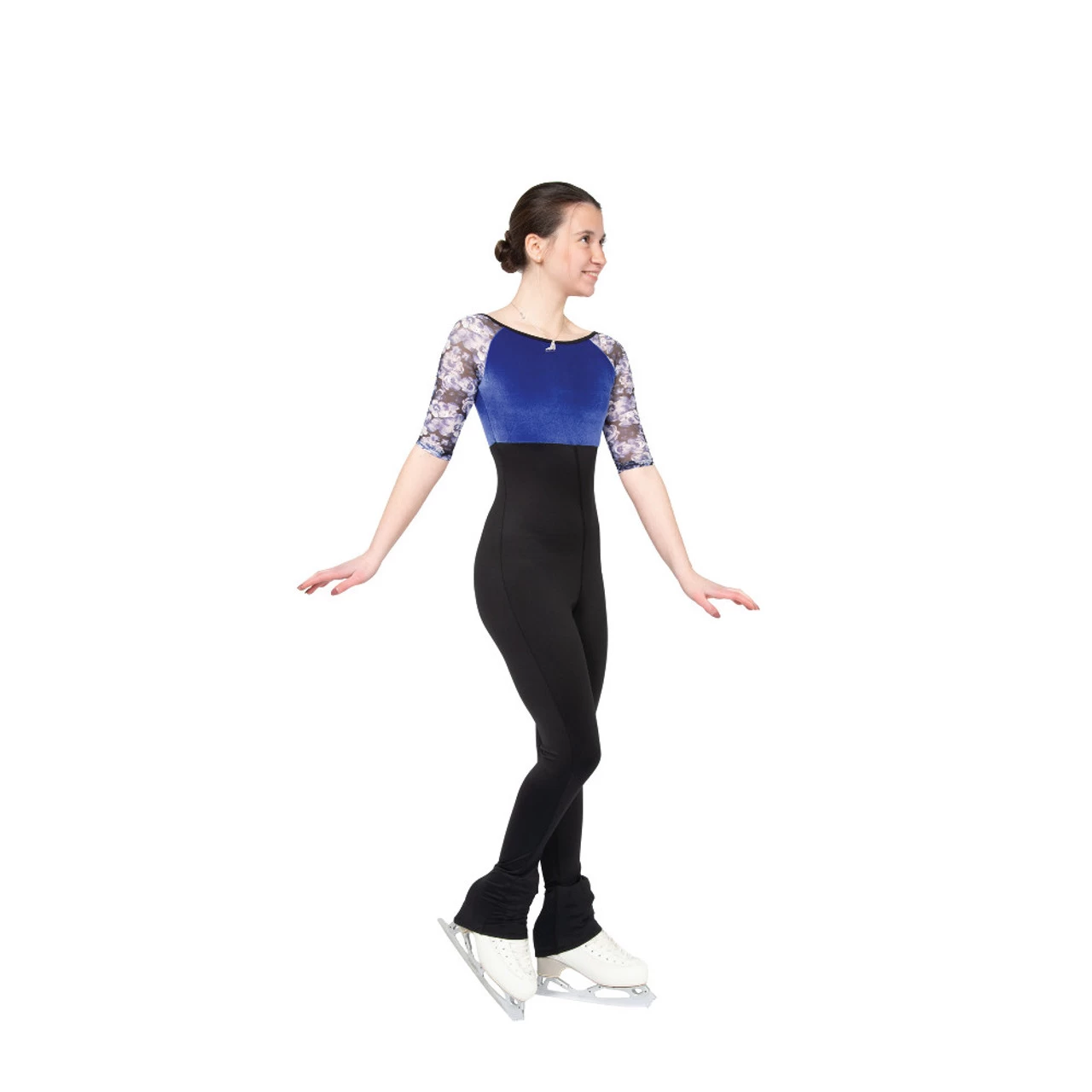 A slim black supplex body legging with an under-the-heel leg line, an empire top in cobalt velvet and sheer elbow length sleeves in sheer print mesh. A built-in shelf bra makes this easy to wear