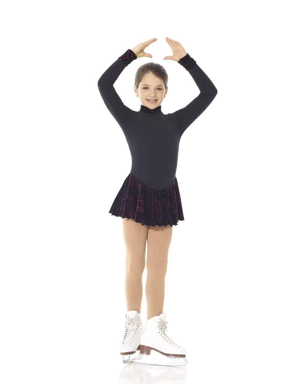 Solid color body, printed skirt, cuff and collar, zipper closing.